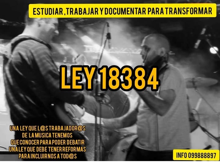 L@s trabajador@s de la musica deberíamos conocer, estudiar y trabajar sobre la ley 18384. Estatuto del artista y oficios conexos (ley de 2008) que puede y debe mejorarse para ser más inclusiva, buscando que logre beneficiar a mas trabajador@s de la musica en todas sus manifestaciones. Para ello es necesario el estudio, el análisis y el trabajo, adquiriendo de esta forma, el conocimiento que nos permita poder lograr verdaderas transformaciones que beneficien nuestras condiciones de trabajo.