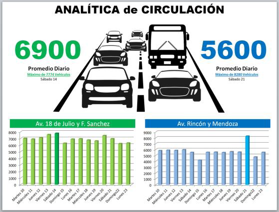 - Se pudieron observar picos de 8280 vehículos por Av. 18 de Julio y 7774 por Av. Rincón, generando así un alto promedio de circulación que va de 5 a 10 rodados por minuto en nuestras principales avenidas.