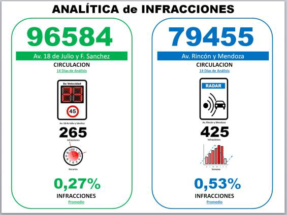 - En Av. Rincón y Mendoza, donde se ubica el Radar sin aviso Visible de Velocidad, se llegó al 0,53% de infracciones sobre el total de los vehículos que circularon en los 14 días analizados, contabilizando 425 infracciones.