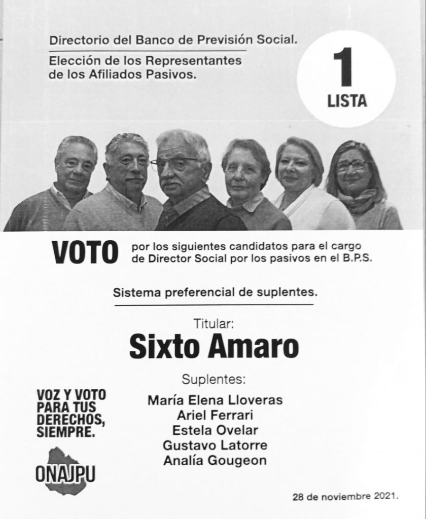 Los jubilados y pensionistas pueden elegir entre la Lista 1, de Onajpu encabezada por Sixto Amaro, la Lista 2 de la Coordinadora de Jubilados y Pensionistas del Uruguay, que propone a Héctor Morales y la Lista 6, del Movimiento un solo Uruguay que promueve a Virginia Vaz Odriozola.