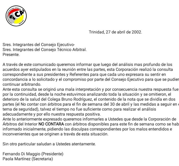 Esta tarde, la CAI (Corporación de Arbitros del Interior) emitió una nota en la cual indica que no estarán dispuestos para cubrir los partidos de semifinales de Copa OFI programados para este fin de semana, lo que significa un apoyo a la decisión comunicada por la AIAF (Asociación Intergremial de Arbitros de Futbol) en el día de ayer.