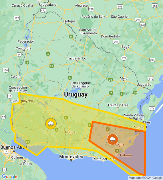 Descripción: Masa de aire cálida, húmeda e inestable afecta el país, generando tormentas algunas puntualmente fuertes. Cabe destacar que en zonas de tormentas se podrán registrar lluvias intensas en cortos períodos, ocasional caída de granizo, intensa actividad eléctrica y rachas de viento fuertes. Se continuará monitoreando la situación y se informará ante eventuales cambios.