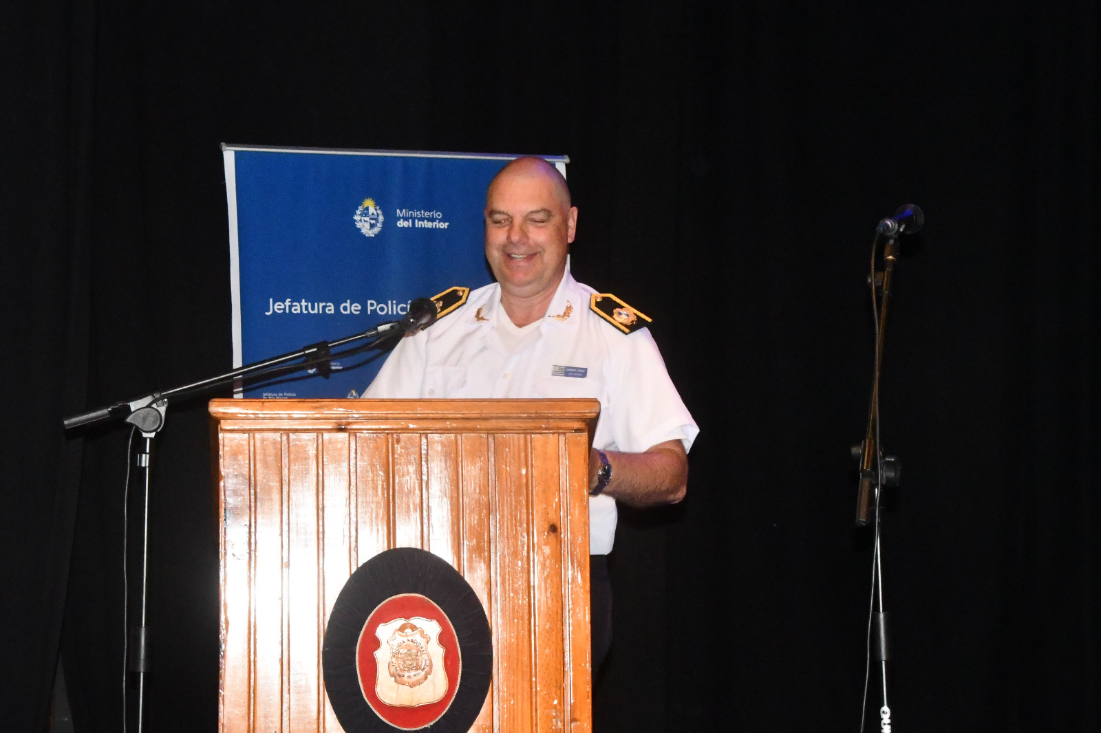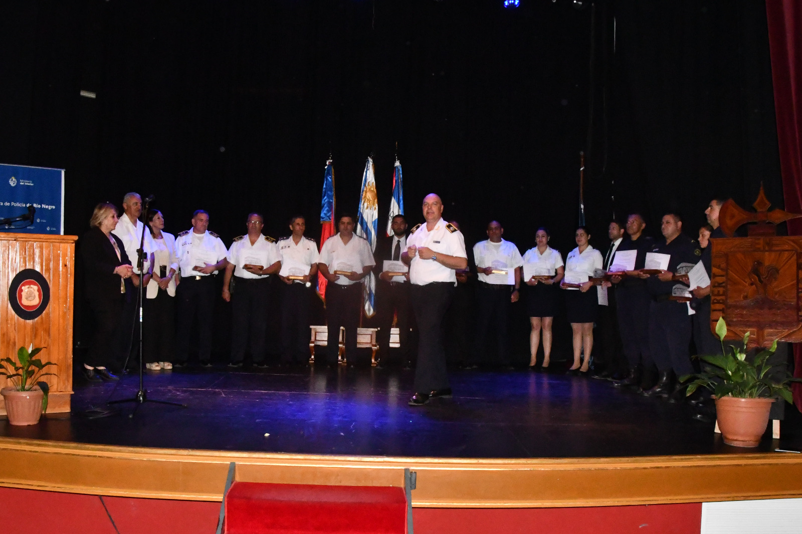 El acto también fue espacio de reconocimiento: se entregaron medallas a funcionarios con 20, 25 y 30 años de servicio, así como premios a dependencias destacadas, menciones por compromiso profesional y el premio “Jefe de Policía”, otorgado a 15 efectivos por el esclarecimiento de un caso complejo de homicidio en Fray Bentos.