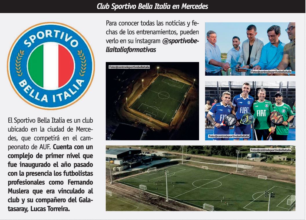 El Sportivo Bella Italia es un club ubicado en la ciudad de Mercedes, que competirá en el campeonato de AUF. Cuenta con un complejo de primer nivel que fue inaugurado el año pasado con la presencia los futbolistas profesionales como Fernando Muslera que era vinculado al club y su compañero del Galatasaray, Lucas Torreira. Para conocer todas las noticias y fechas de los entrenamientos, pueden verlo en su instagram @sportivobellaitaliaformativas