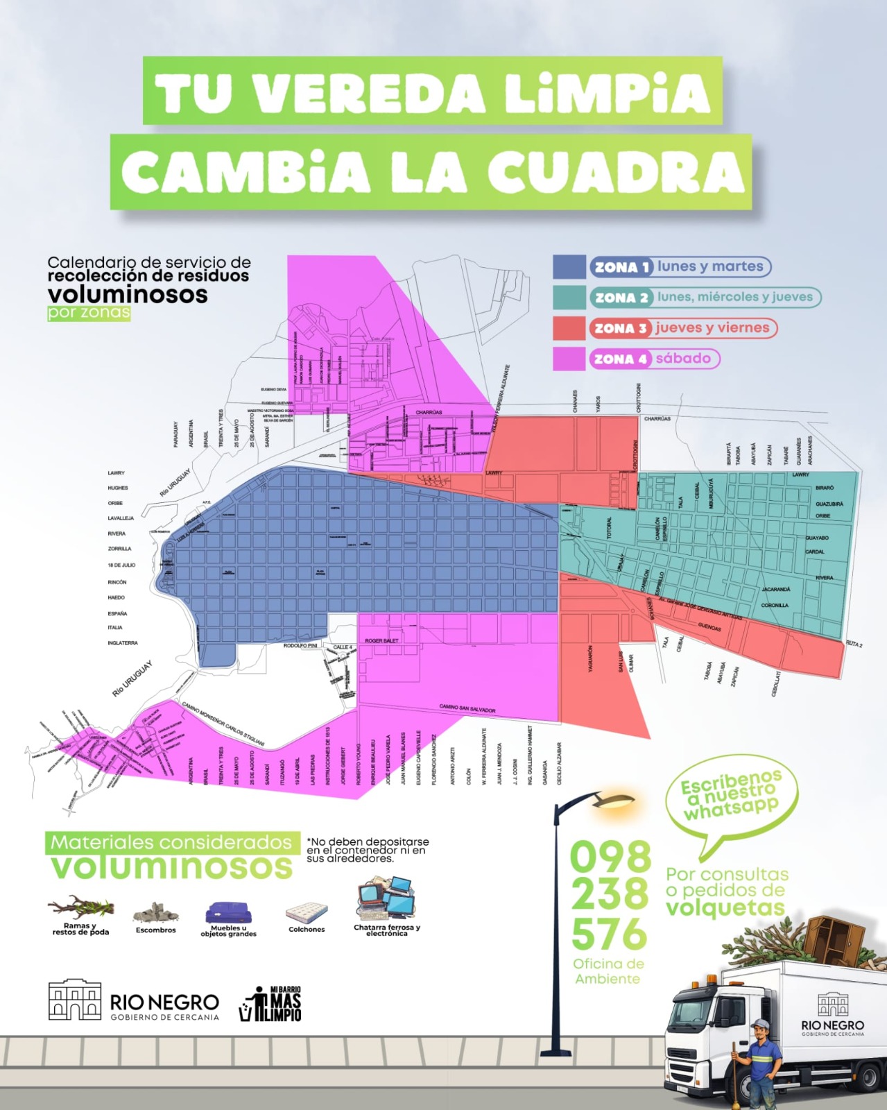 La Intendencia de Río Negro puso en marcha un sistema organizado de recolección de residuos voluminosos puerta a puerta, con días definidos según cada zona de la ciudad de Fray Bentos.
