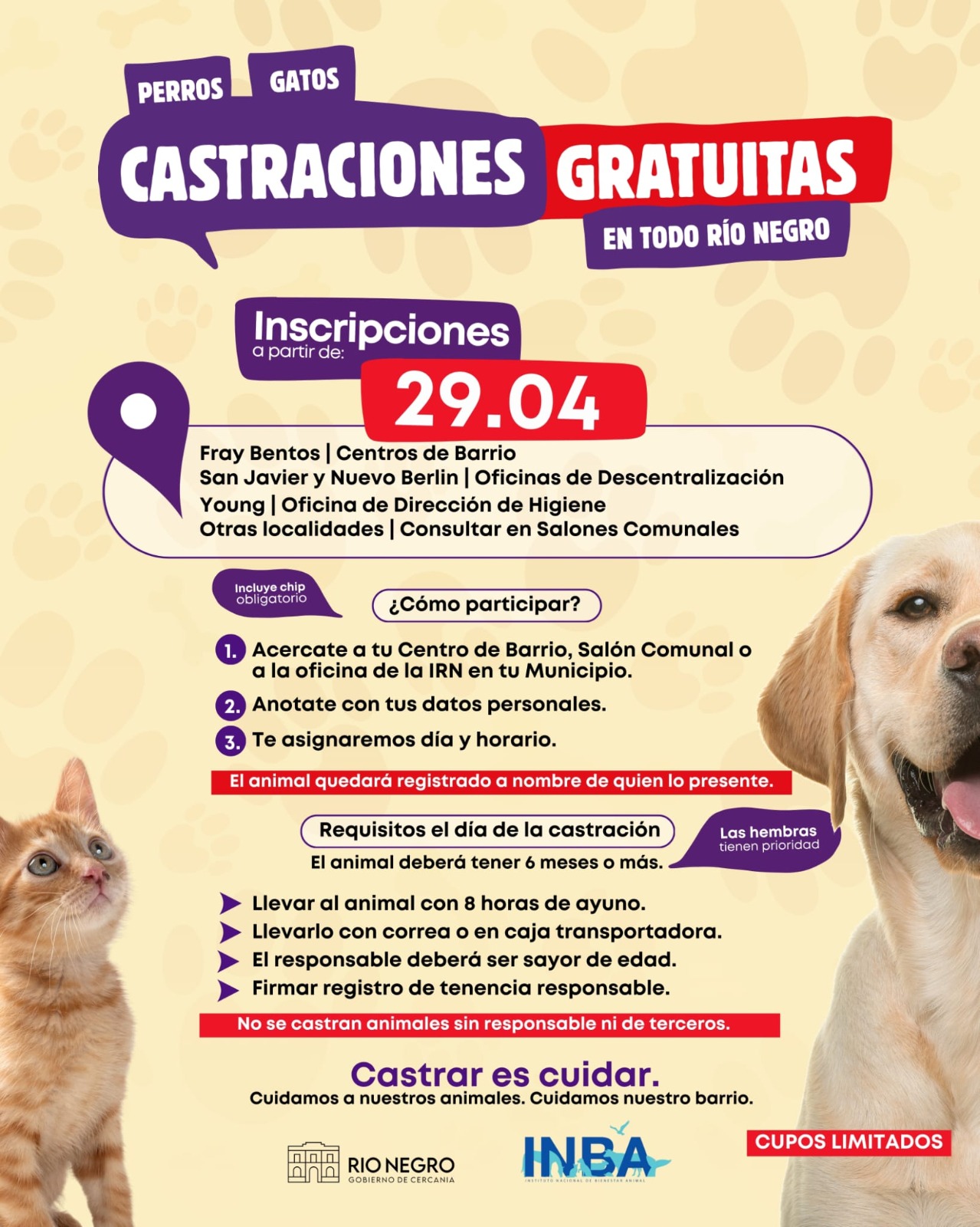 La Intendencia de Río Negro, en coordinación con el Instituto Nacional de Bienestar Animal (INBA), comenzará el miércoles 29 de abril el período de inscripciones para jornadas de castraciones gratuitas de perros y gatos.